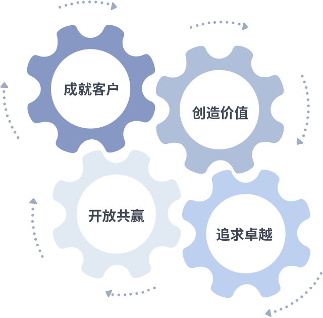 成就客户是一切决策的出发点,,创造价值是衡量所有工作的标准,,追求卓越是我们做事做人的态度,,,,开放共赢是我们的格局也是最终的结果。。。。价值观的齿轮环环相扣,,推动着组织里的每个人不断向前。。。。